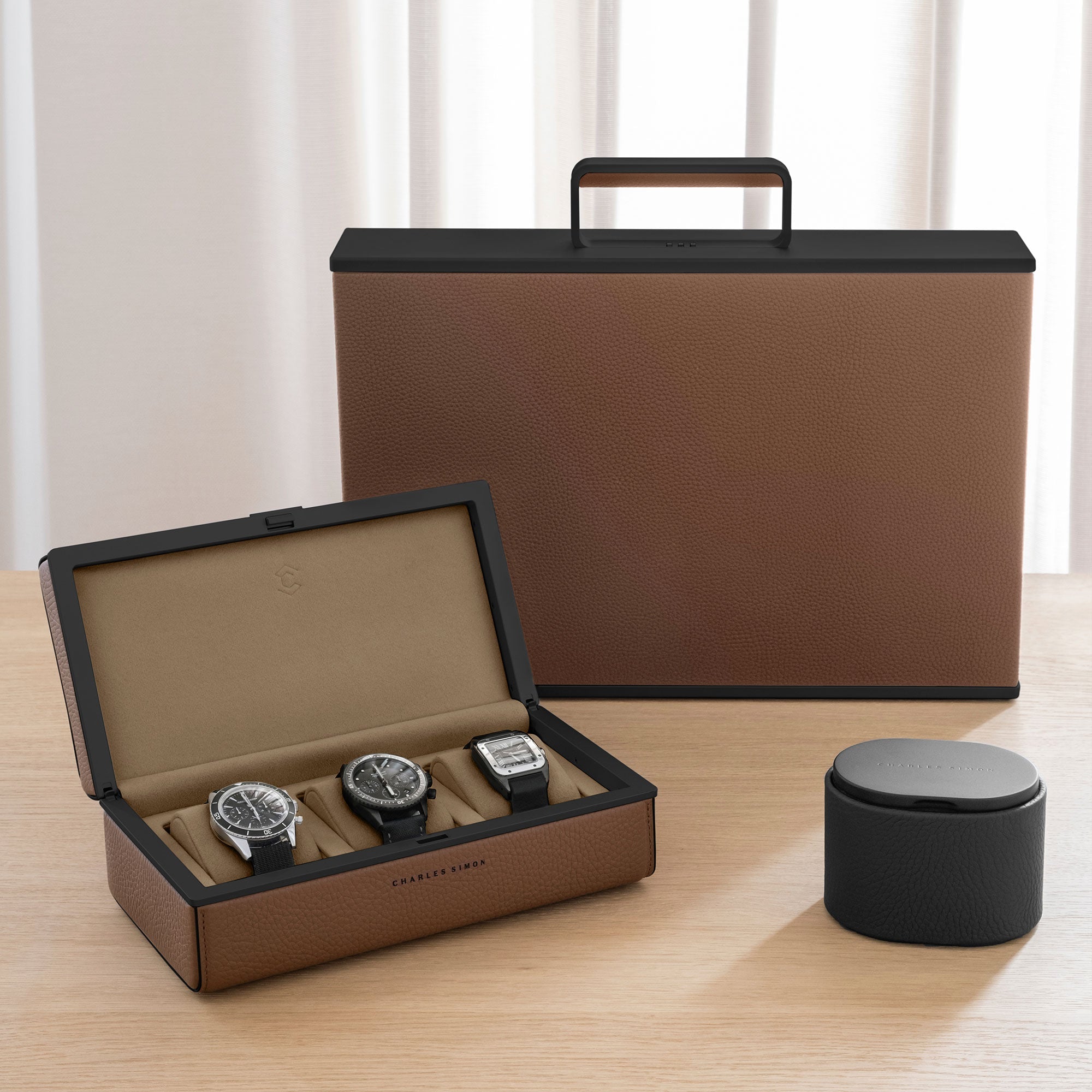 Store, transport and display your watches in style with the Eaton 3 Watch case. This semi-rigid case features a timeless, sleek design and is crafted by hand from premium French bull leather and an anodized aluminum frame.